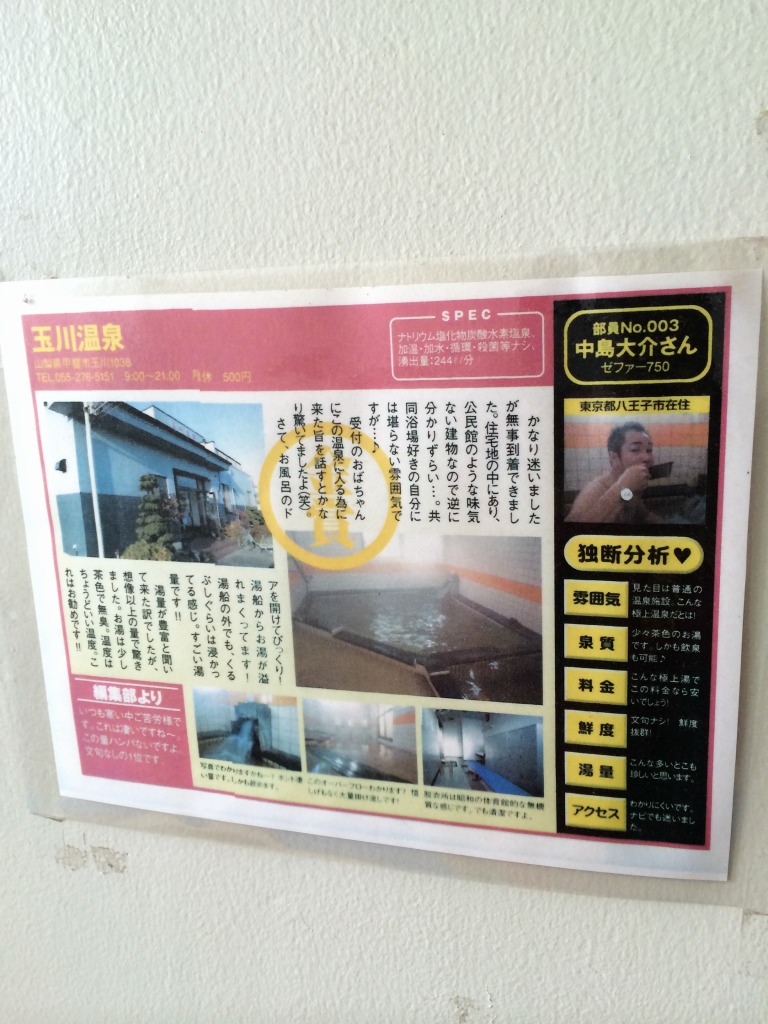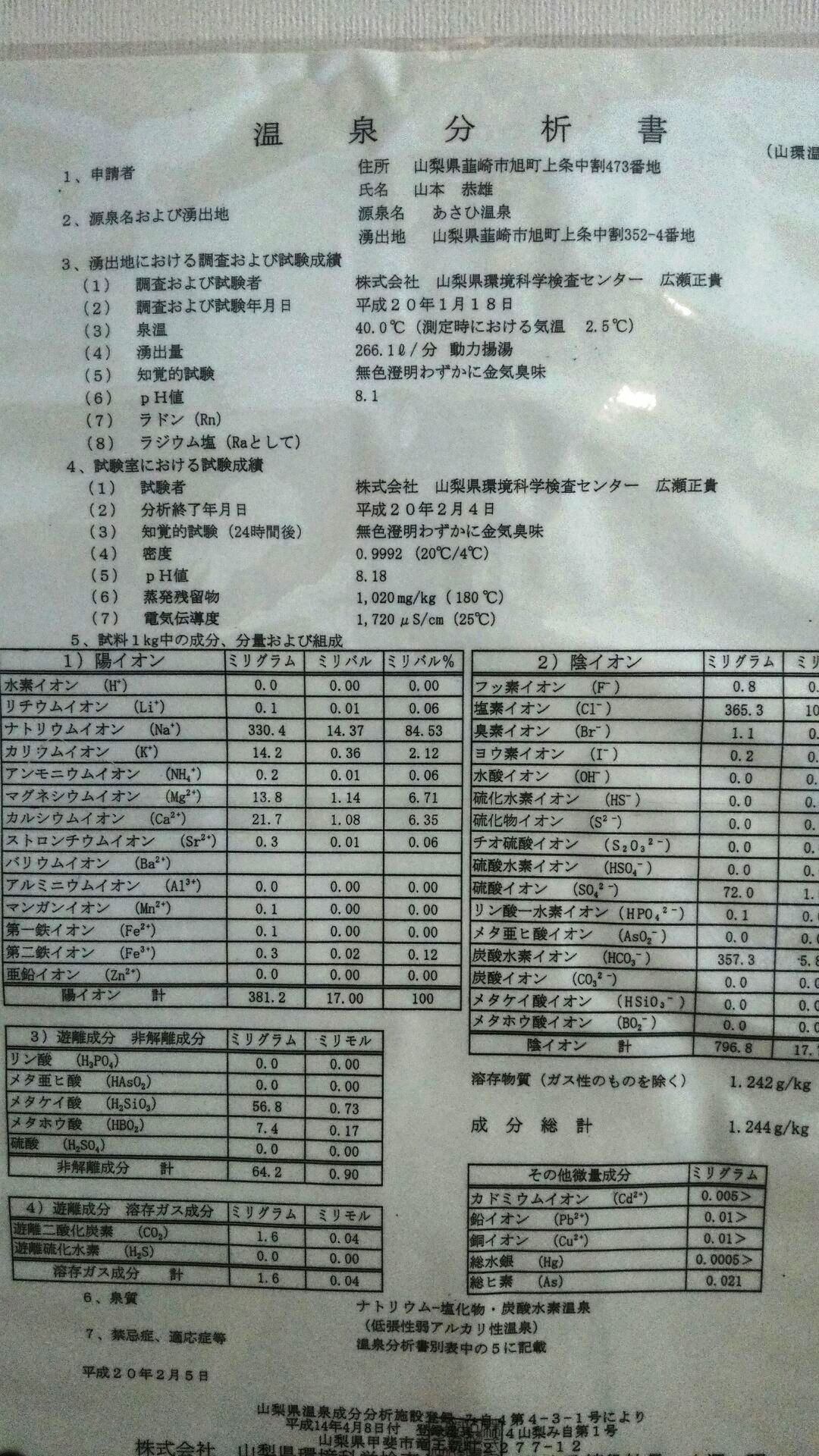 さてそこからですが、先日何かの温泉番組を見ていた所 「見てください肌に無数の泡が付きます!!」とか、たいして付いてるようには見えないけど、のたまわってるわけですよ。そうしたらやっぱり本物を体感したくなるでしょう。「山口温泉」は副部長がレポートしやがったから、んじゃ「韮崎旭」かな!と言うわけで2度目の訪問です。