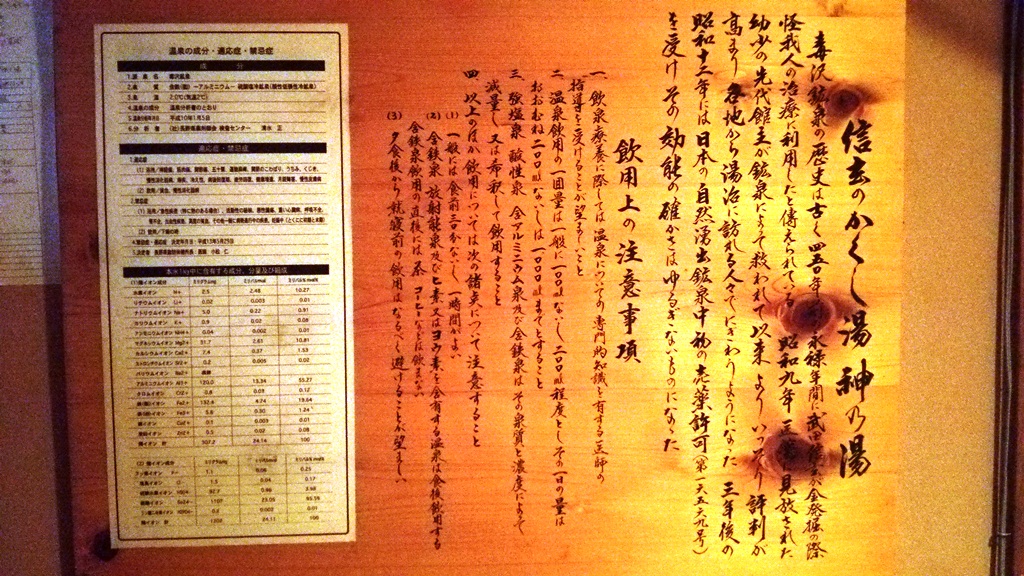 飲泉が出来、柄杓に取って勢い良く飲んだら、ま~酸っぱい事!レモン水のような感じでした。その後も加温浴槽に浸かっては出て休憩を繰り返し40分は浸かりましたかね。充分感応して出てきました。